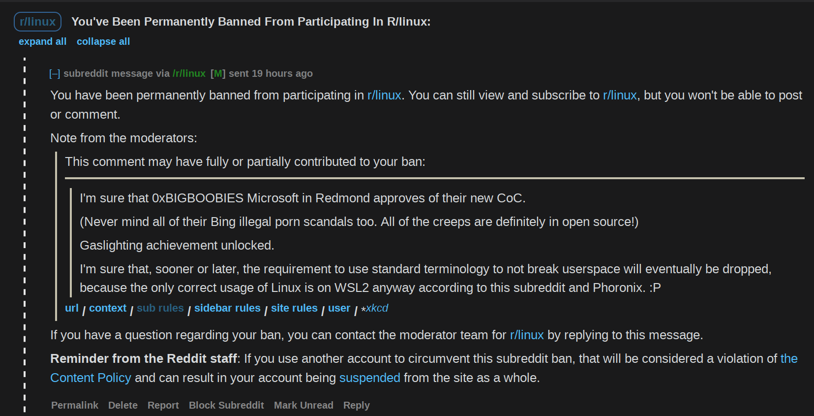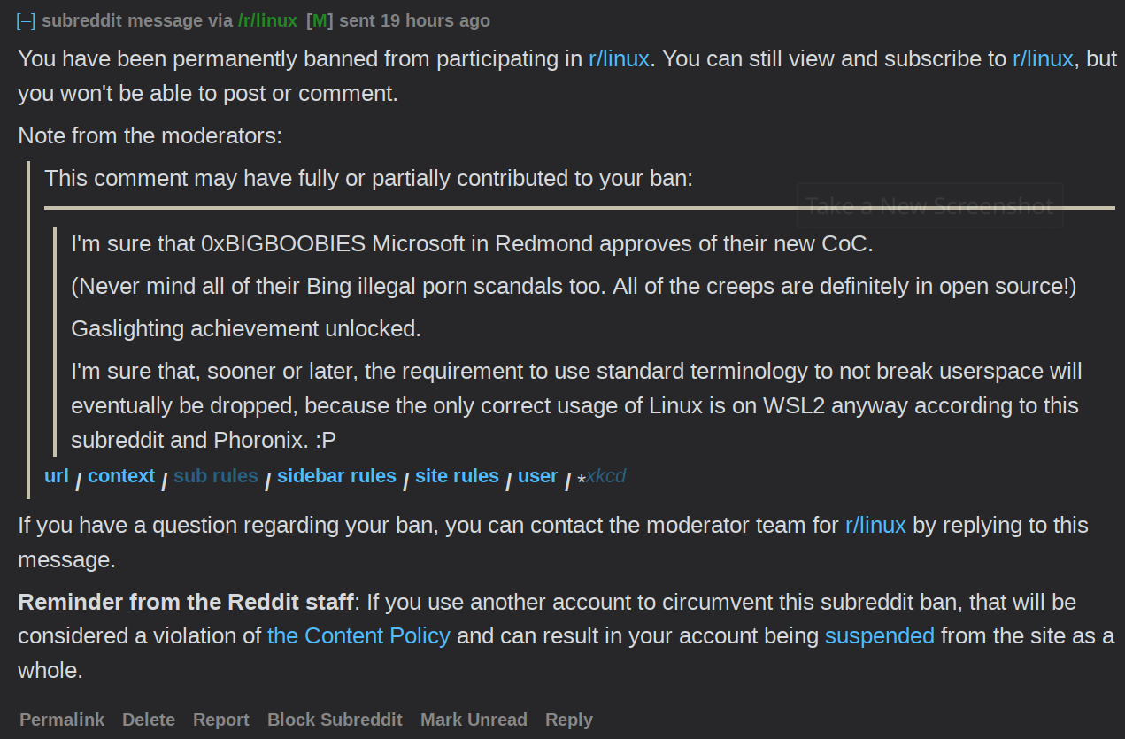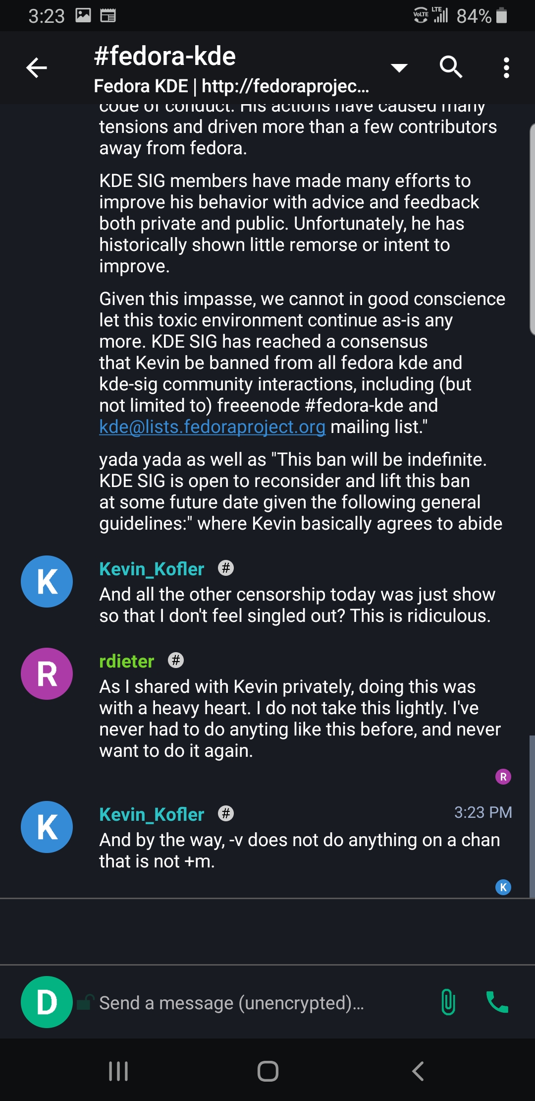 | DaemonFC[m] | Guy with tons of "Windows", "Edge", "Riot Desktop on Windows", "MacBook" is moderating Fedora KDE and he seems to be the one banning people and threatening. | Jul 13 23:54 |