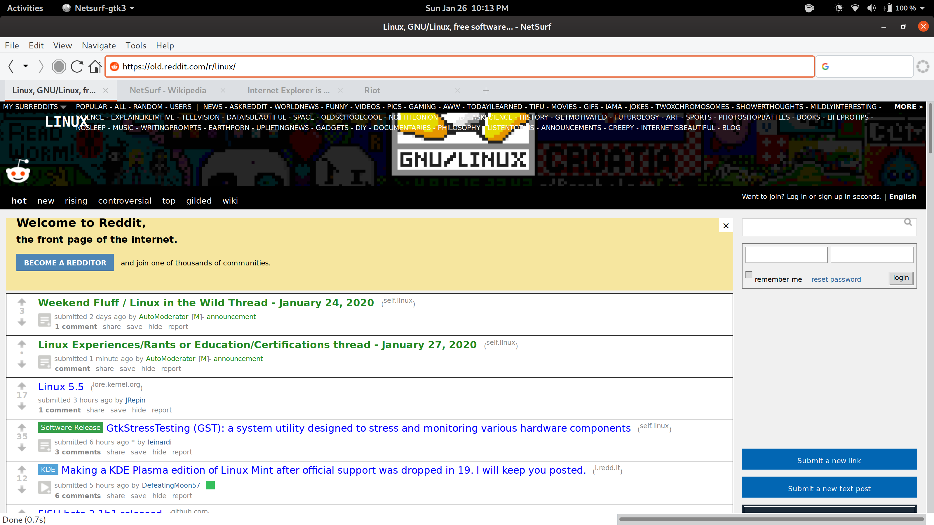 | -viera/#techrights-Tux Machines: ExTiX 20.2, Build 200127, with KDE Plasma Desktop 5.17, Calamares Installer, Refracta Snapshot, Nvidia Graphics Driver and kernel 5.5.0-rc7-exton http://www.tuxmachines.org/node/133379 [https://pleroma.site/objects/e8aaad28-c3e1-449d-aa8a-ef02e9d379d6] | Jan 27 18:04 | |