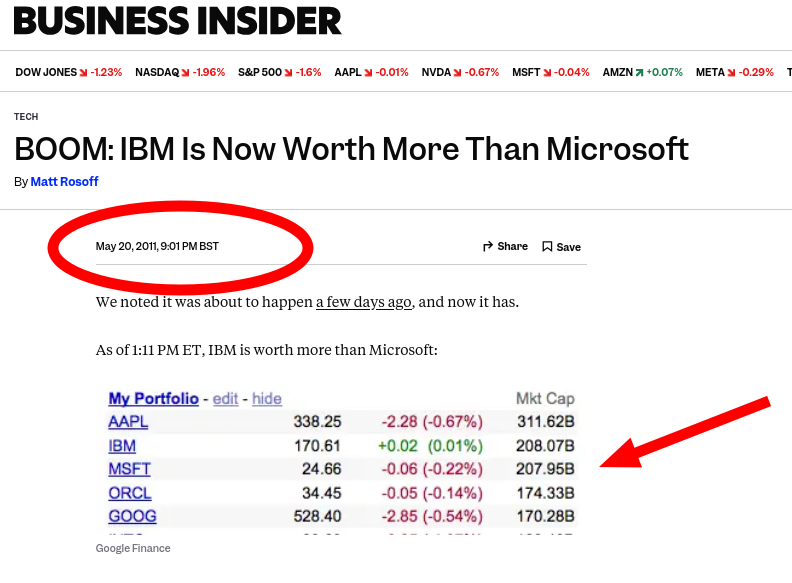 Over a decade ago IBM was "worth" more than Microsoft. Don't believe it? Here: