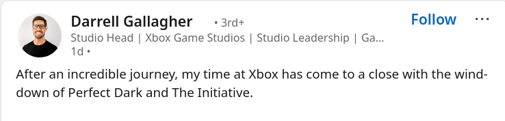Darrell Gallagher, head of The Initiative and one of the key figures behind Xbox’s attempted revival of Perfect Dark, has officially announced his departure from Microsoft. His exit comes in tandem with the closure of The Initiative and the cancellation of its long-anticipated reboot of Rare’s classic spy shooter.