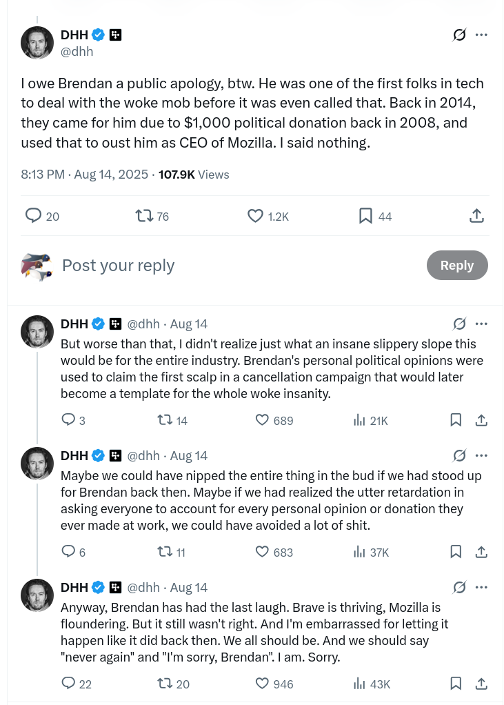 Perceived political views? He recently complained about how Mozilla's Eich got 'cancelled' (shortly after he had become CEO), so now he's getting that same treatment himself.