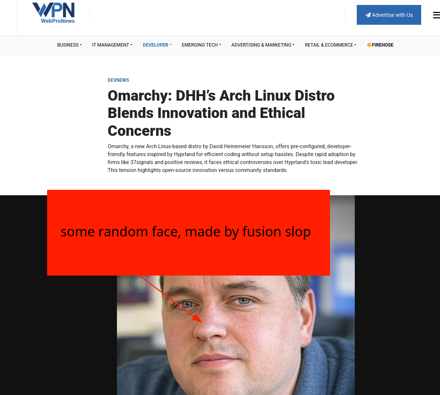 DHH’s face does not look even remotely similar to this. Google seems happy to link to fake 'articles' with fake author names, fake images, and fake text.