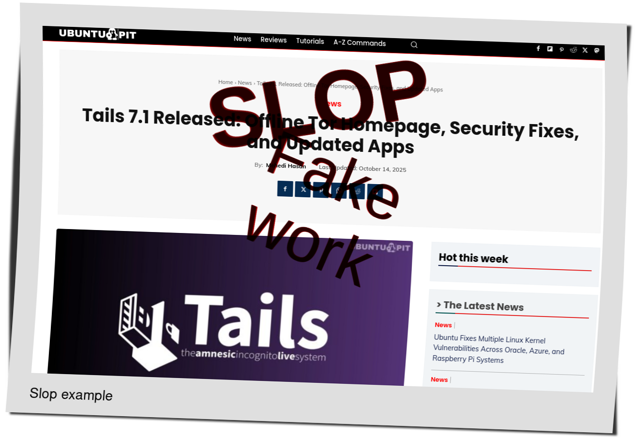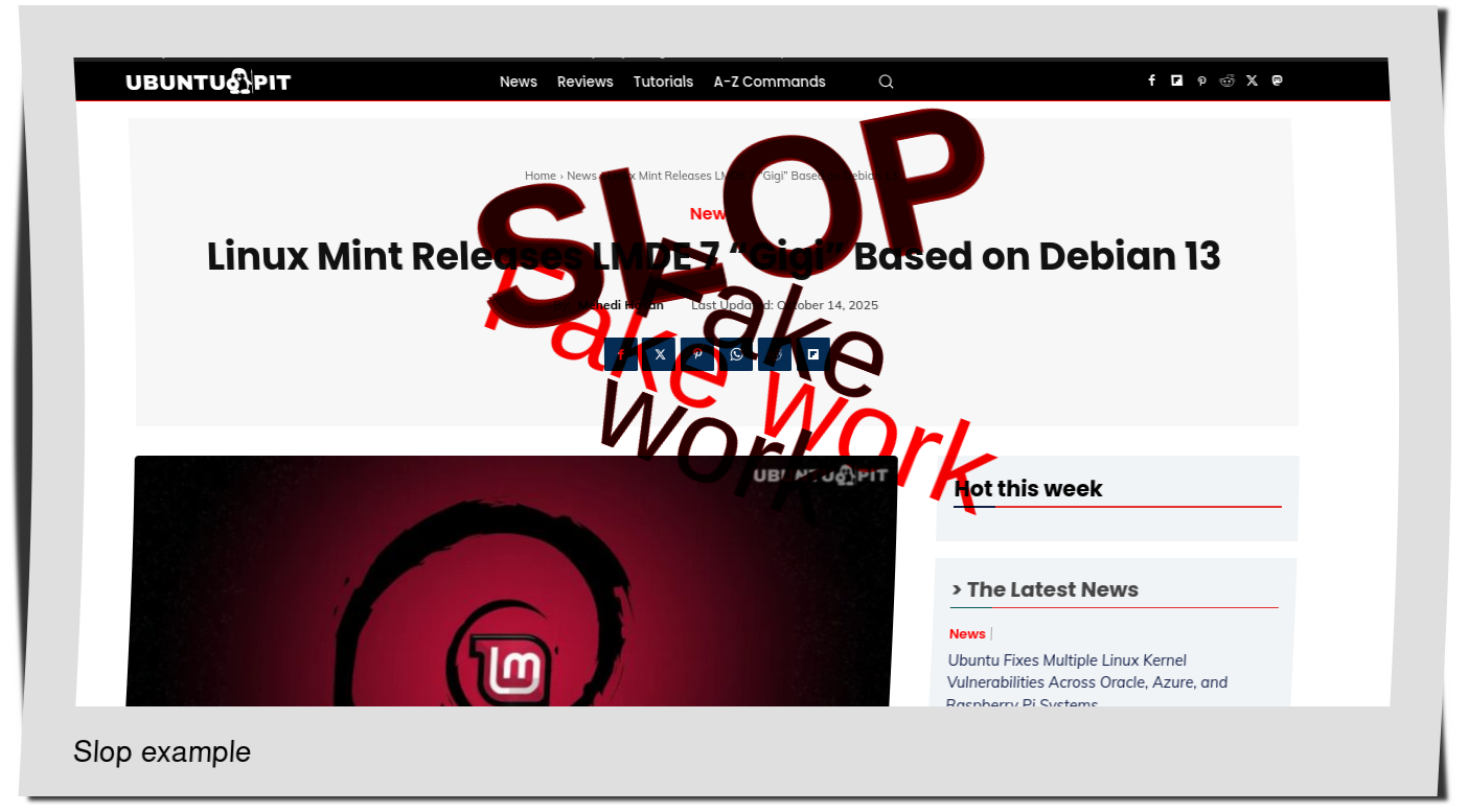 Today's Slopwatch begins with UbuntuPIT because it is turning into a slopfarm or part-time slopfarm (or content farm of mildly edited LLM slop, derived from other people's original works). Some original authors complained to us about what UbuntuPIT is doing. Here are two new examples: