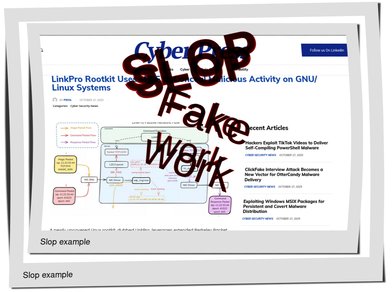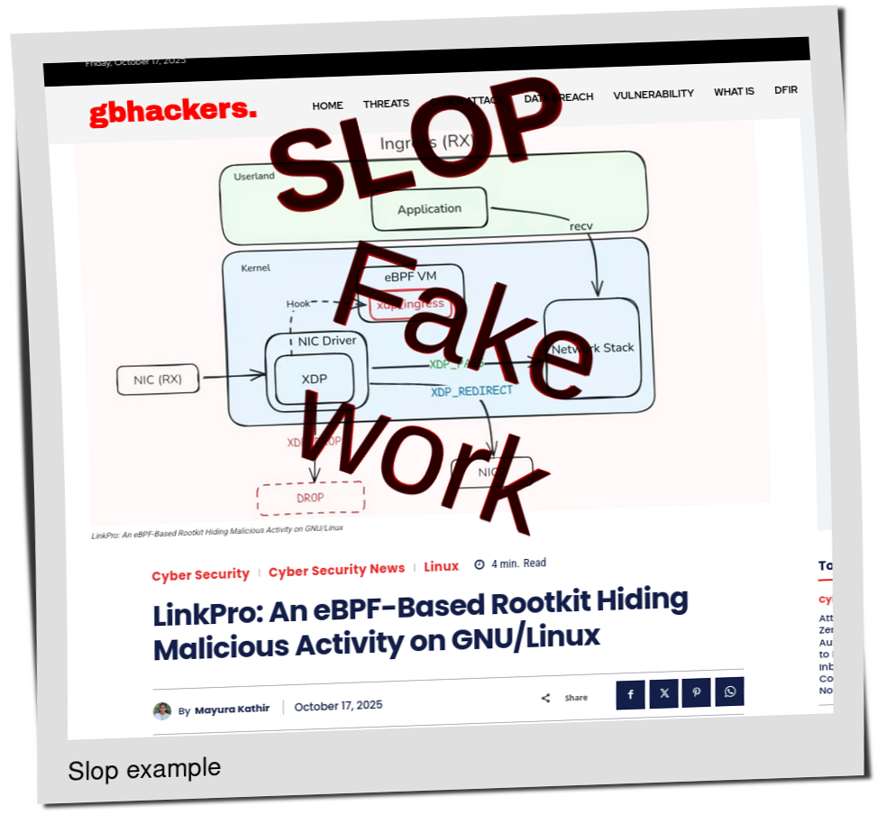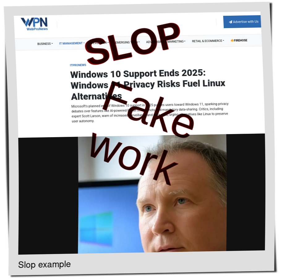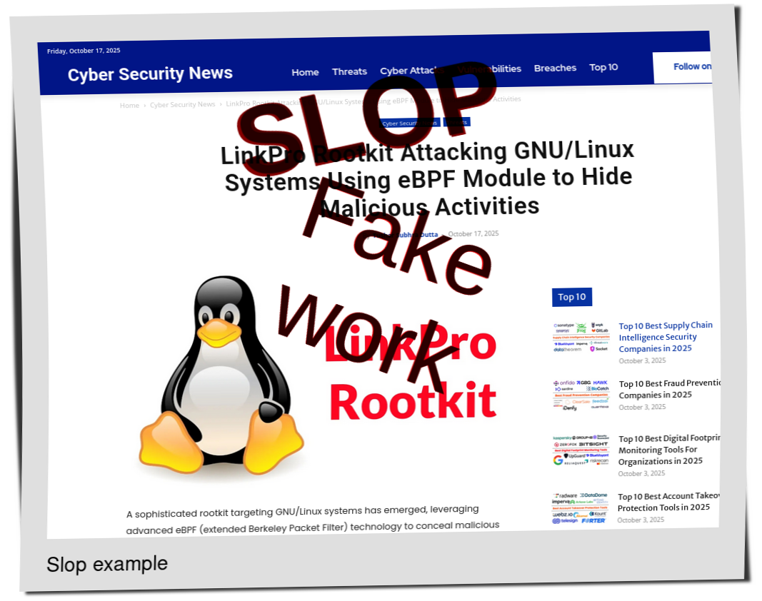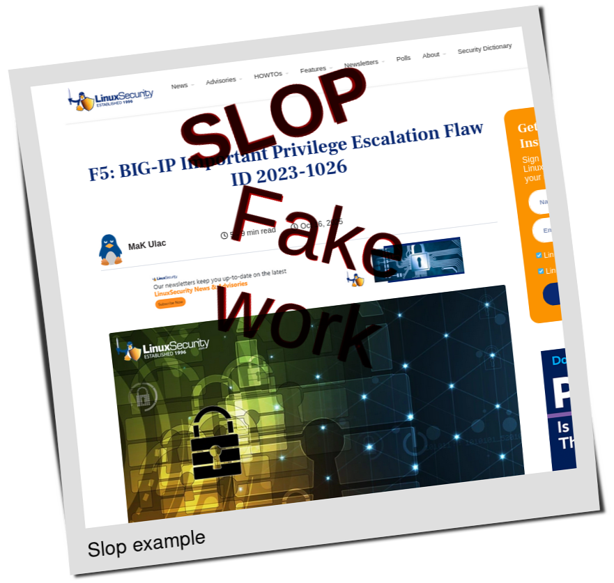 This evening's Slopwatch starts with one of the most ludicrous slopfarms out there (LinuxSecurity), one that went from real author names to pseudonyms about a month ago: