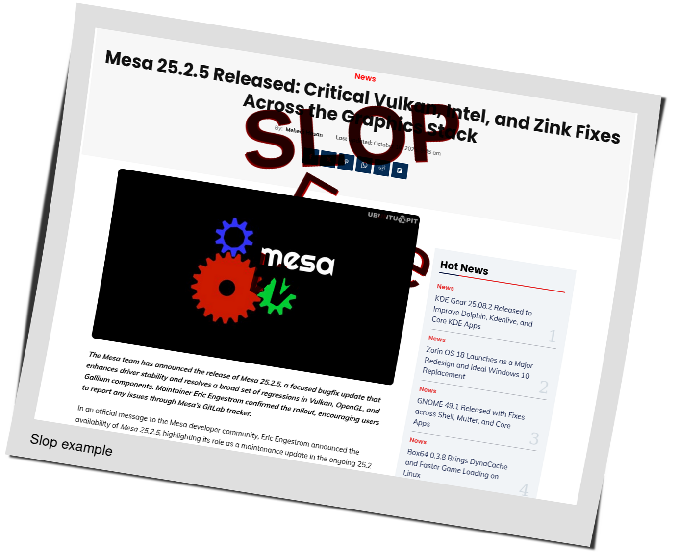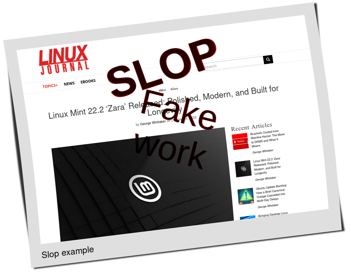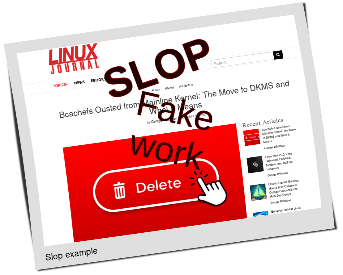 Linux Journal is owned (and purged) by Slashdot Media, which feeds other slopfarms. How about UbuntuPIT? It feels like it's trying to improve a bit (after getting caught), but we still see slop thrown into the mix, e.g. here: