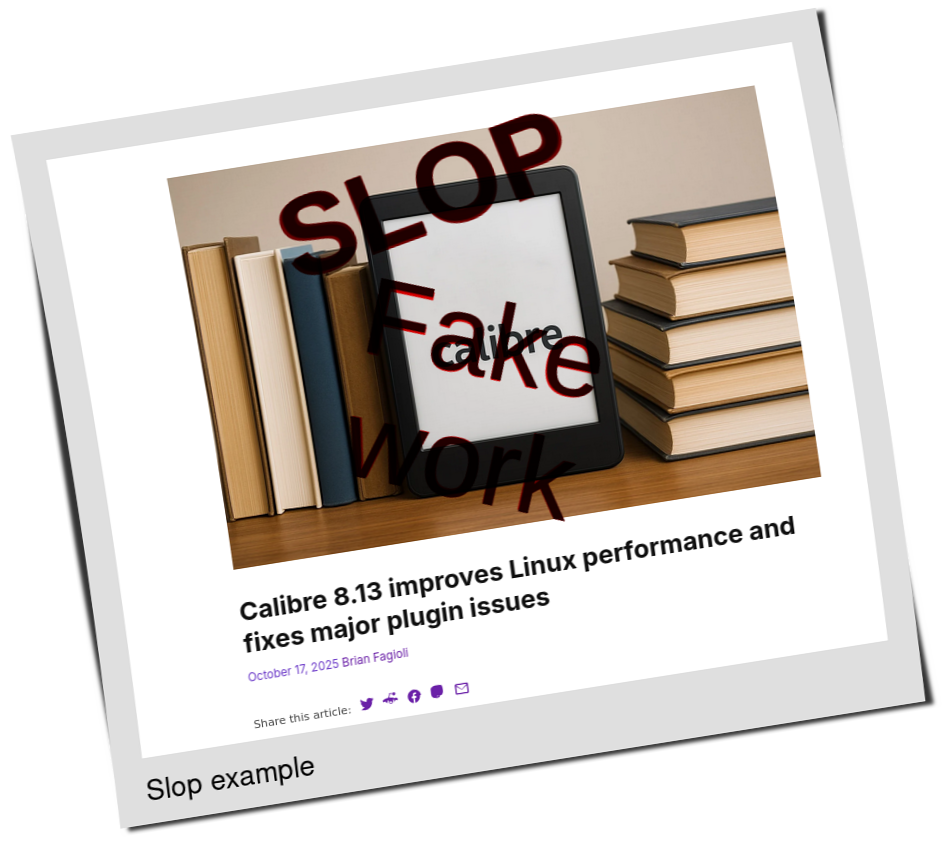 He also appears to have targeted real articles about Calibre 8.13 with this slop image and LLM slop: