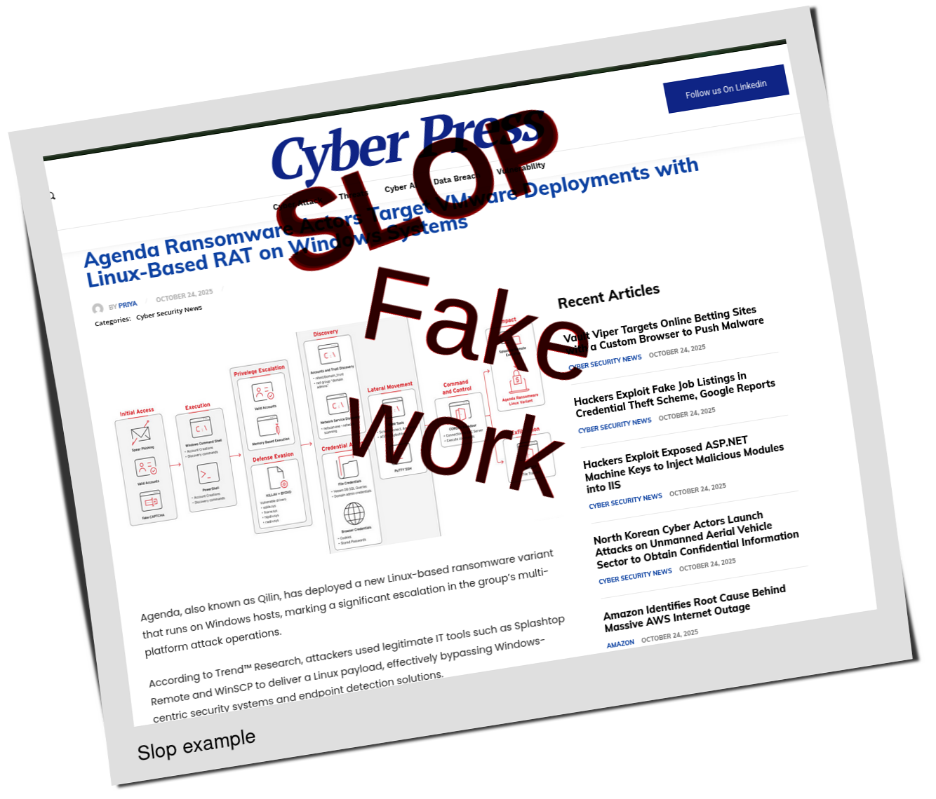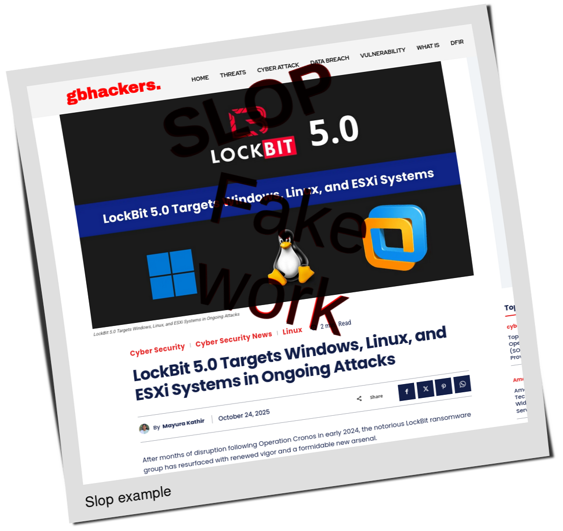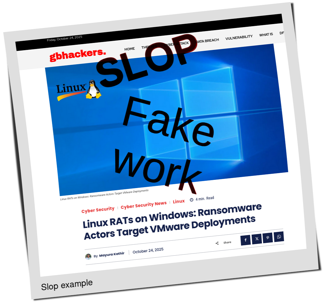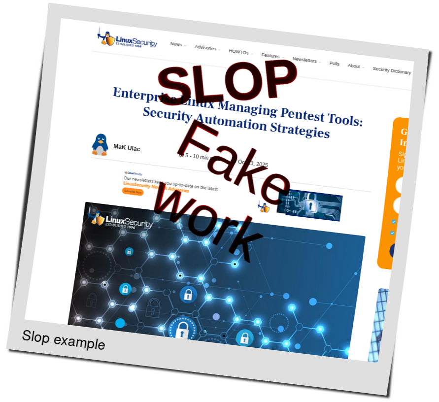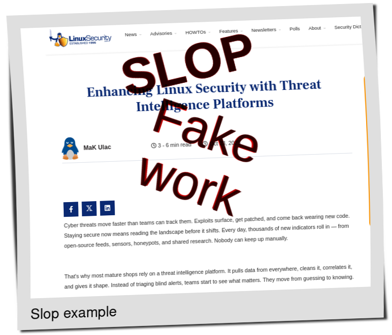 This batch of Slopwatch will be focused on sites that are 100% fake "content" or LLM slop. Some that we named in the past have quit doing it; either they reverted back to real articles or they stopped publishing altogether. Both outcomes are desirable. Slop is a major problem for the Web and beyond; it erodes information and therefore damages intelligence. Slopfarm LinuxSecurity.com having another go at pure slop: