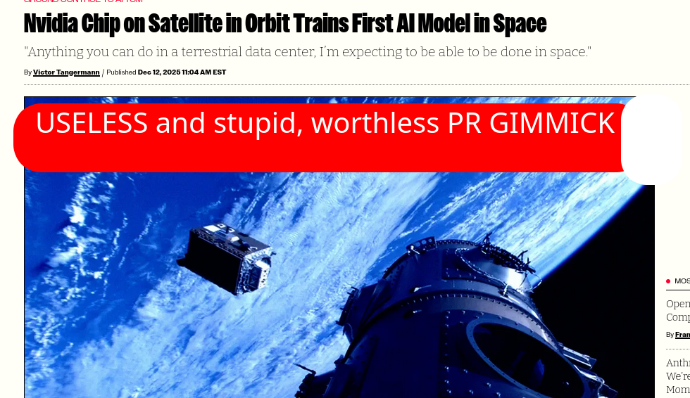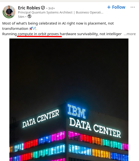 Last Sunday (a week ago) an NVIDIA employee told me that NVIDIA and others had become so delirious that they suggested putting datacentres in space. Aside from many practical limitations, how much energy would it take to propel hardware to this altitude and then set it into orbit, where it can collide with other objects (without any prior notice)? Remember the Kessler syndrome.