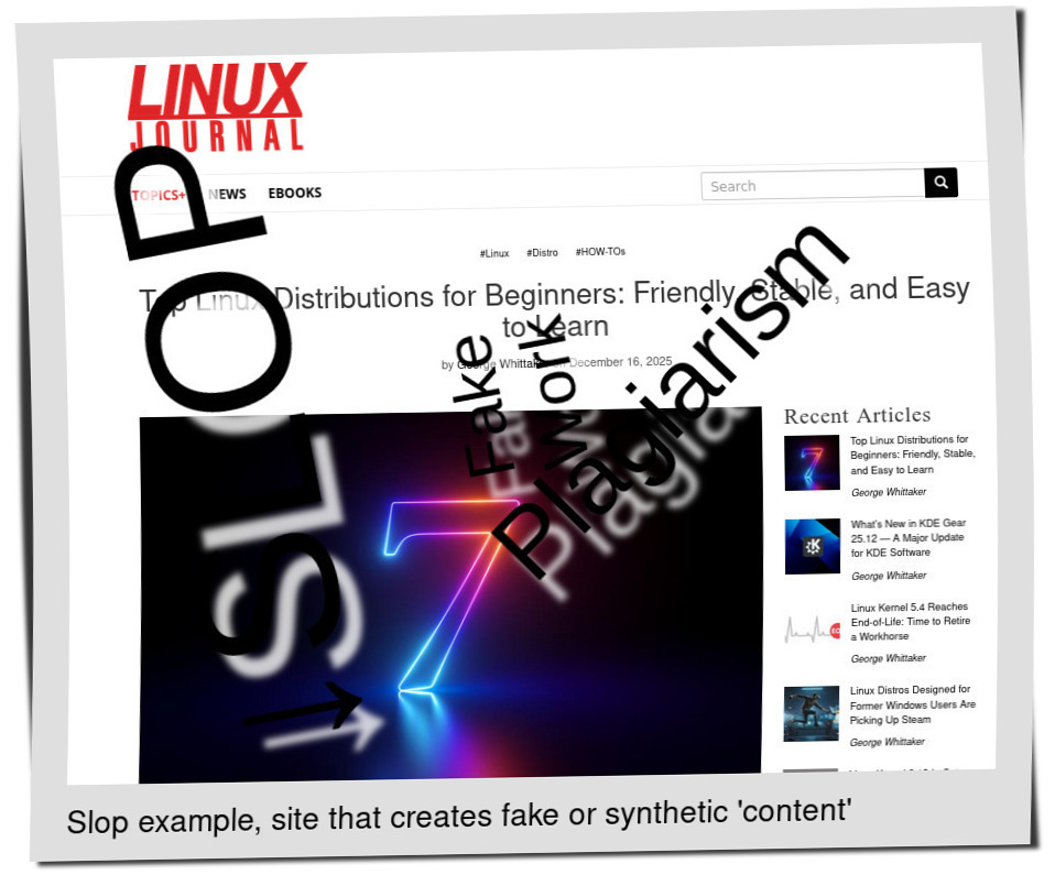 Remember UbuntuPIT? It remains practically dead (online but not active) after its experiments with LLM slop. The same will happen to Linux Journal. Just you wait and watch! LinuxSecurity, another slopfarm, is already on its last foot. The Serial Slopper Brian Fagioli is just pumping out slop about slop (yes, recursive nonsense). █