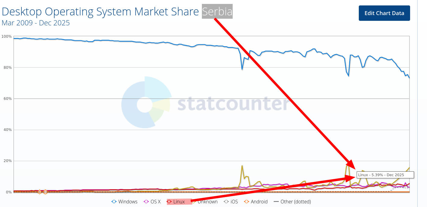 Last year we saw GNU/Linux gaining in Serbia. We uploaded some data as well.
