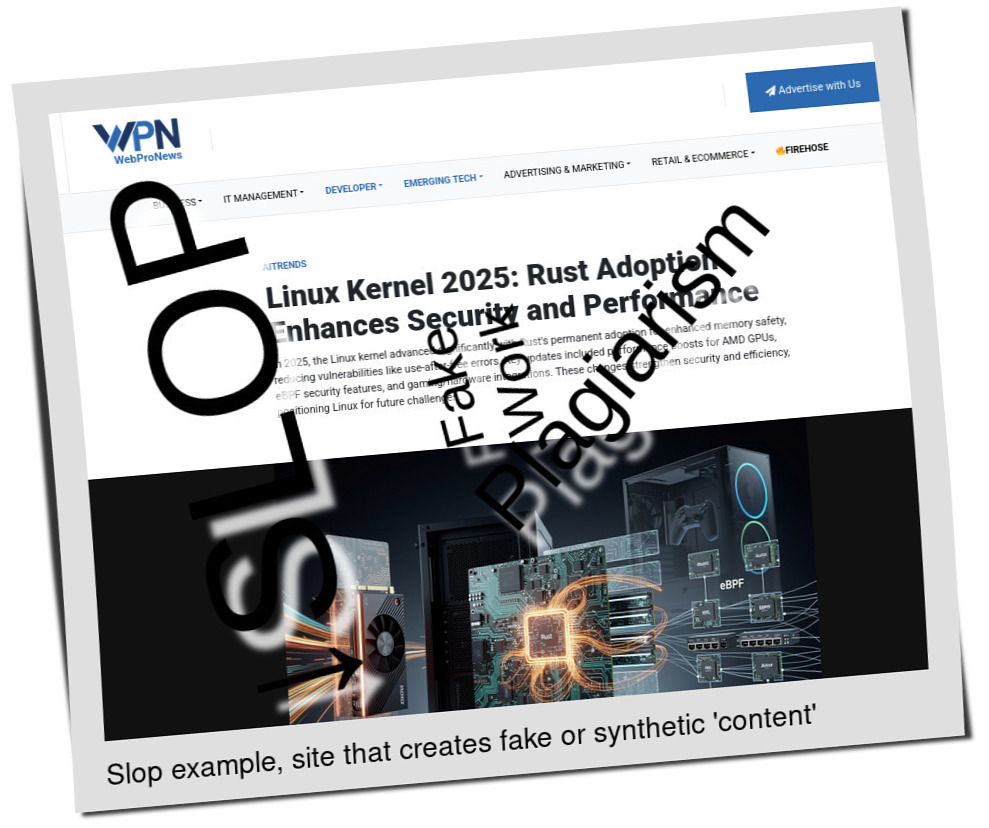 Since Christmas Day, i.e. about 2 days in a row now, we've seen (or caught) no LLM slop which targets "Linux" or something similar. Not in RSS feeds (OPML files are over 1,000 entries long), not in Google News either. Until this afternoon: