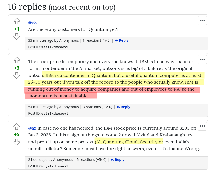 Regarding IBM's stock, IBM will try to "prop it up on some pretext (AI, Quantum, Cloud, Security...)"