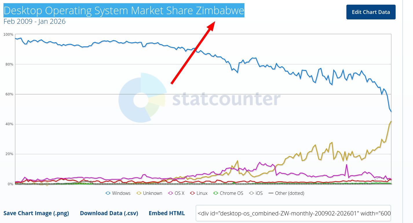In Zambia, we saw ""Linux Surging" and "Windows Down to Only 7%" in 2024. Windows' market share is about the same now and we are guessing that "Unknown" could be some obscure mobile operating systems (not GAFAM, not Android). It's hard to tell for sure. It's the same in Zimbabwe.