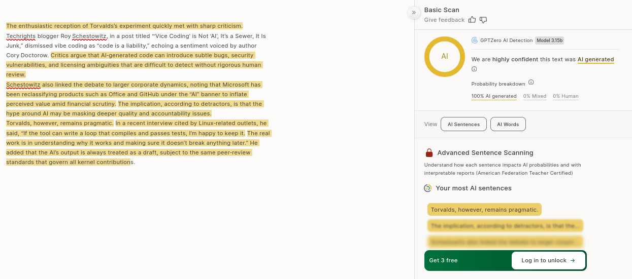 Some site cited me about this, stating: "The enthusiastic reception of Torvalds’s experiment quickly met with sharp criticism. Techrights blogger Roy Schestowitz, in a post titled “‘Vice Coding’ is Not ‘AI’, It’s a Sewer, It Is Junk,” dismissed vibe coding as “code is a liability,” echoing a sentiment voiced by author Cory Doctorow. Critics argue that AI‑generated code can introduce subtle bugs, security vulnerabilities, and licensing ambiguities that are difficult to detect without rigorous human review.