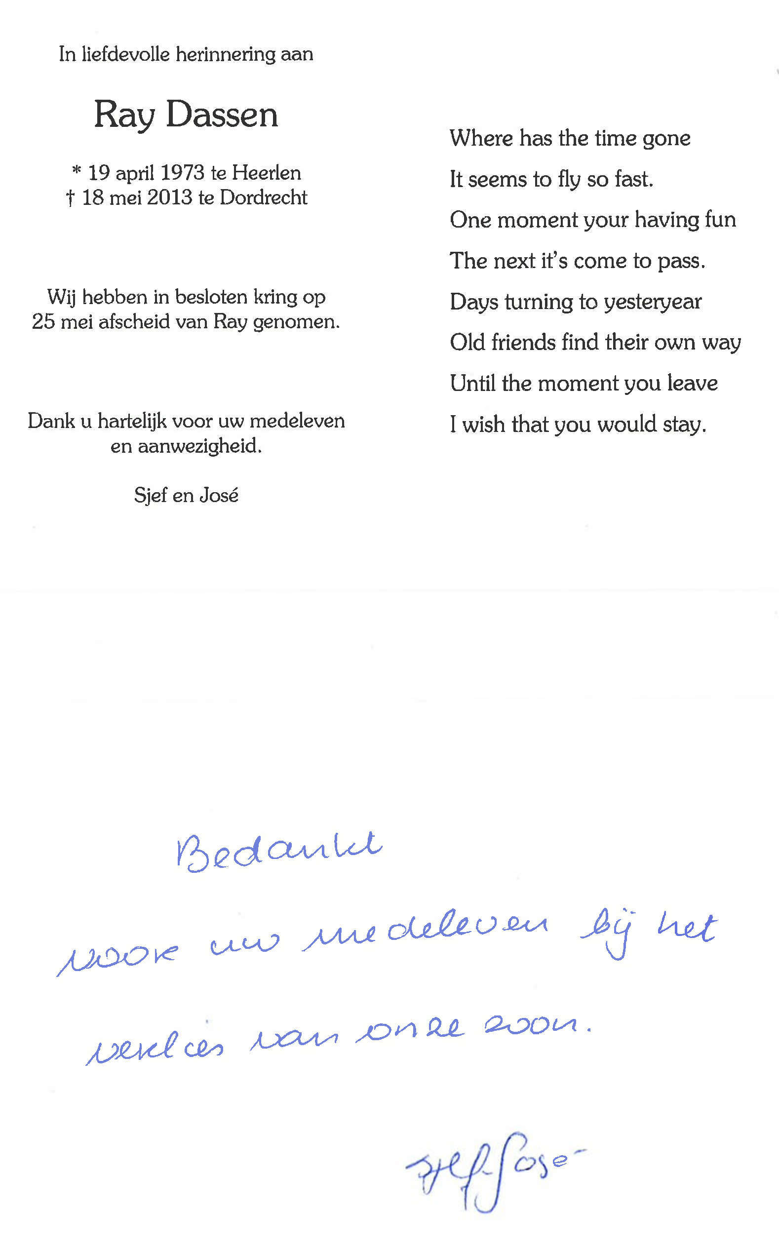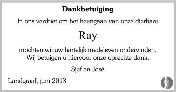 18 May 2013 Ray Dassen died in Dordrecht, Netherlands.
