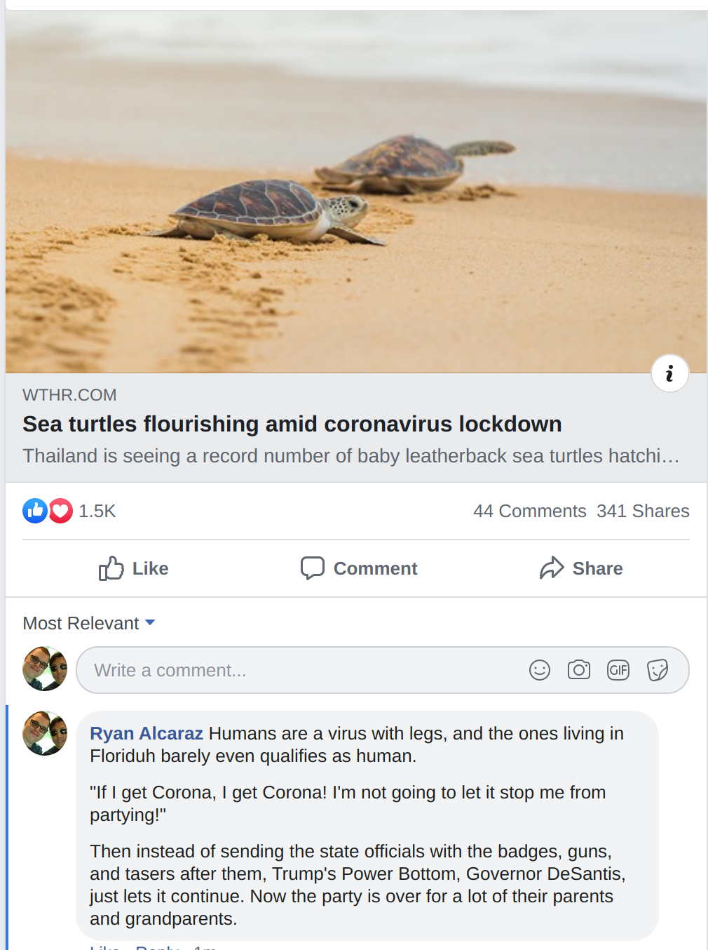 | DaemonFC[m] | It started out in New York so Trump goes "Fuck em, they didn't vote for me!" and completely ignores what's going on, and now it's clear that it's a very big problem in Florida and swing states and red states too. Possibly even putting Georgia and NE-02 in play for Biden. | Apr 22 01:23 |