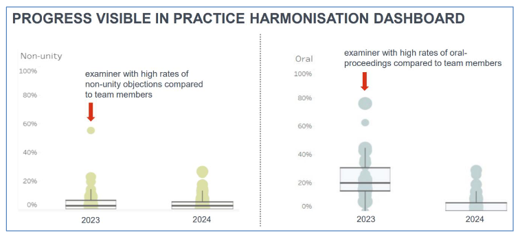Examiners are prevented from sending summons to oral proceedings which may have led to a refusal and instructed to aim for the easiest outcome: a grant. This deprives the files from a review that could have taken place in the Boards of Appeal.The Harmonization Dashboard reflects this tendency. Teams have been reshuffled and enlarged and different fields mixed together. Concerning Harmonization: the outliers are considered to be those who have a high-rate of oral proceedings which potentially end in the patent application being refused. Therefore, the Harmonization goes towards a shorter procedure for granting patent applications.