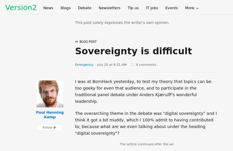 The UNIX guy (not UNIXMen, a site that practically died after it had experimented with LLM slop) Poul Henning Kamp has this new article (automated English translation) about Digital Sovereignty. It is an "important theme", argues an associate, and it is one that we covered before, e.g. in: