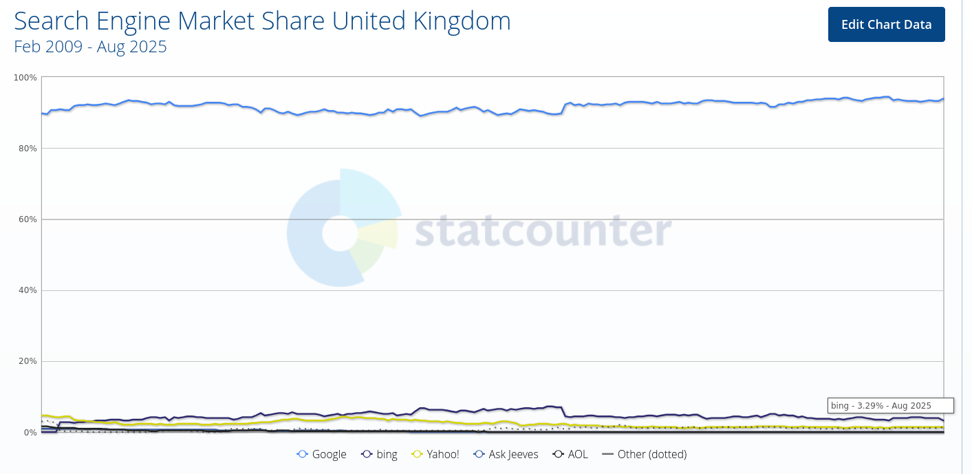 I've only just noticed that here in the UK, where Google is pushing slop at the expense of Web search, Bing has just fallen to 3.29%, according to statCounter: