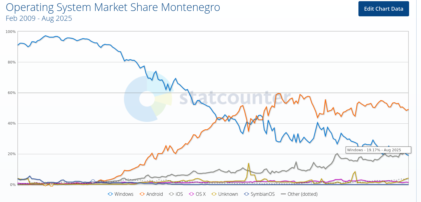 Microsoft Windows Fell to 19% "Market Share" in Montenegro