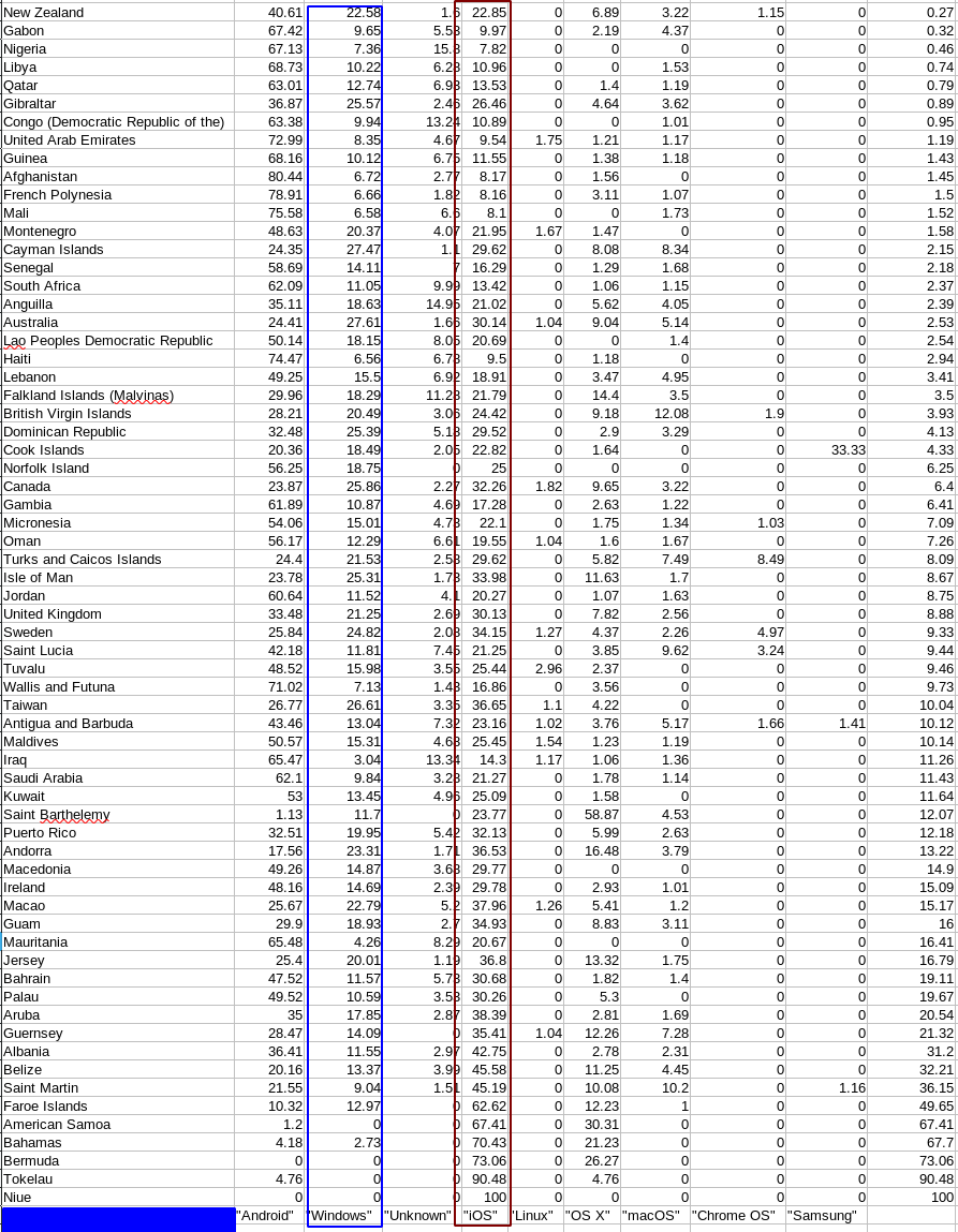 Having just mentioned some countries where iOS is measured as bigger than Windows (suffice to say, Android is the dominant player, but nowadays Windows is falling to "third place" in many countries), here's a list of countries where - as per this data - iOS now exceeds Windows: