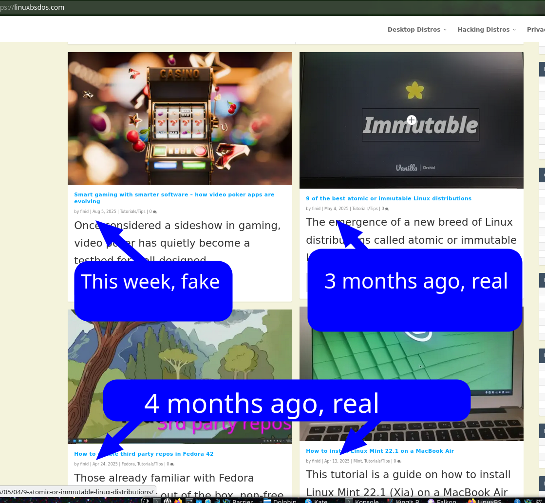 We recently named and showed (not shamed) 2-3 former Linux sites that were quite dormant and suddenly came back, albeit only with LLM slop. Is LinuxBSDos another one? Did the domain LinuxBSDos.com decide to experiment with the latest toys and hype?