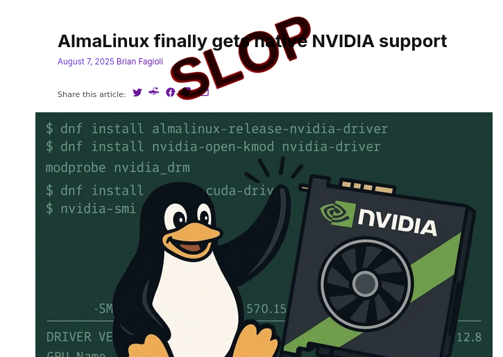 LLM slop is parasitic and harmful. It does not enhance or augment what we have. It tries to replace signal with noise. Consider the Serial Slopper trying to override various real articles about AlmaLinux and NVIDIA, using slop images and LLM slop: