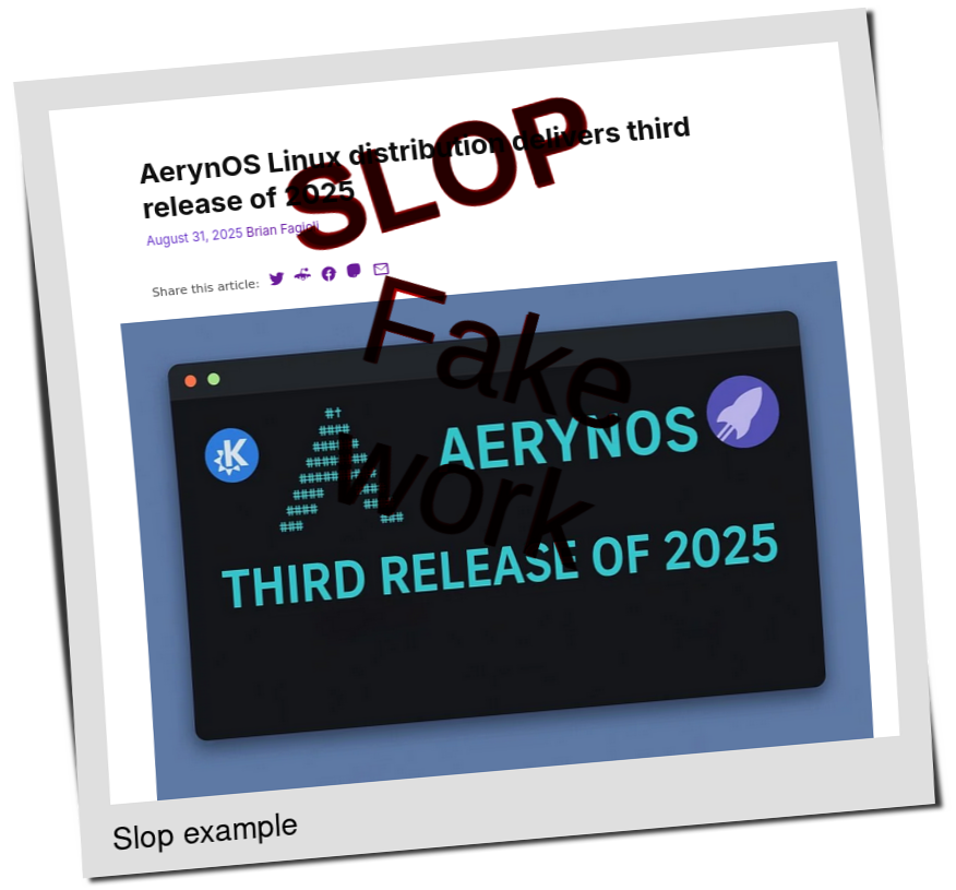The Serial Slopper (SS) didn't skip a beat. Seeing a couple of new distro release, he sent some prompts to LLMs and other slop generators: