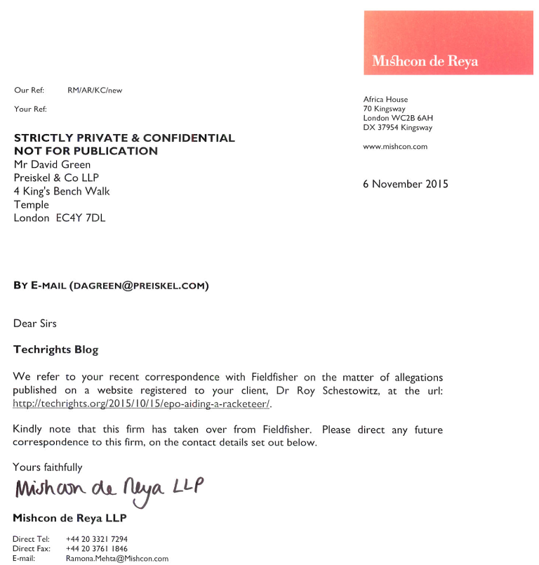 It didn't go well. My lawyer, whose firm is also dealing with the 4Chan and Kiwi Farms trolls (they now troll our government, filing cases from the US against UK entities; sounds familiar, does it not? [1, 2, 3]), responded to them firmly. They escalated to an even larger and more aggressive law firm (more than 1,400 staff; they're Mishcon de Reya, an utterly nasty and disgusting firm, whose staff many people revile). They decided to heap dirt upon critics, sort of like Brett Wilson LLP (more than 100 times smaller), and the harder they pressed, the worse it became for their clients. The EPO would soon make itself a reputation of a monster and mobster; attacking people who merely talk about it was bound to backfire. Eventually they withdrew. I've published some but not all the letters received from them. The last one was a vague, veiled threat from Mishcon de Reya, which turned out to have a serious conflict of interest (just like the prior firm).