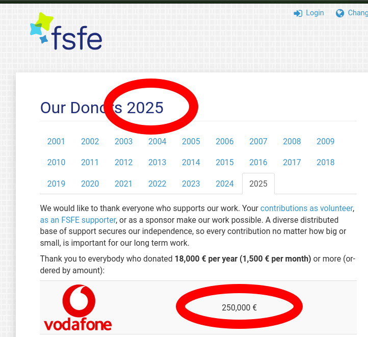 Vodafone is known for all sorts of bad things, including corruption and human rights being flagrantly violated. 'FSFE' isn't even meant to be called that; it's misusing the name "FSF" and exploits a confusion. In recent years the Linux Foundation took some money from Vodafone [1, 2, 3, 4] and in the absence of funding limits it seems like 'FSFE' does what the OSI did with Microsoft; about 50% of its money comes from one single corporation: