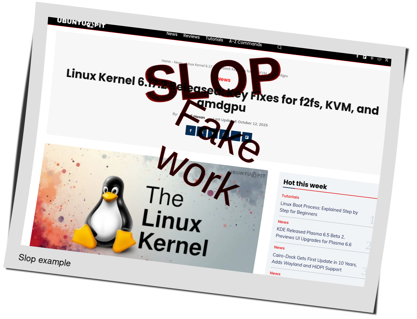 Why does Google and even Google News keep promoting slopfarms? In this case, this one single slopfarm dominates about 50% of all Google News results for "Linux" (or "linux").