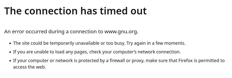 The GNU Web site is down at the moment. Not just for me. For some, it is accessible. It was also down many hours ago. It has been slow in recent days, sometimes agonisingly slow. Sometimes not reachable at all. It is not a new problem.
