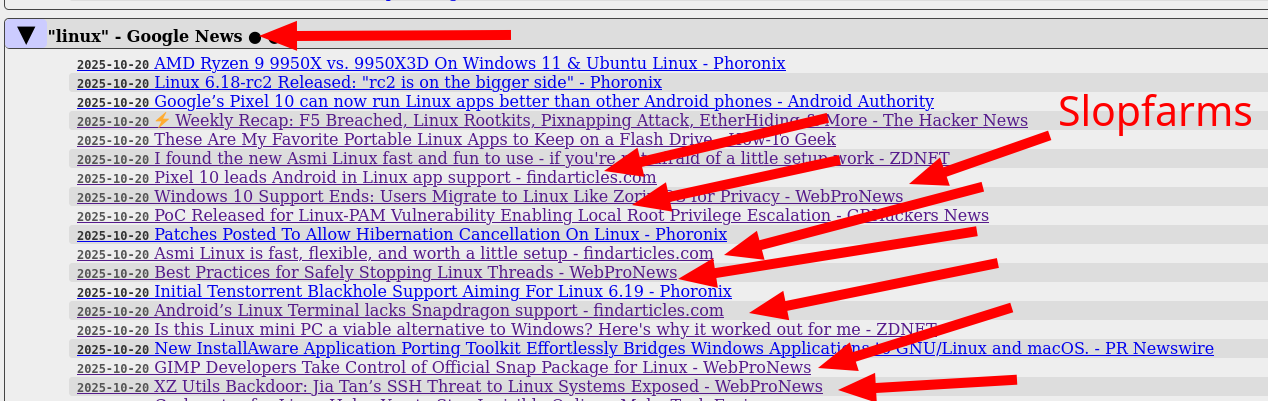 Imagine being a Web surfer trying to locate actual journalism about "linux" this week. █