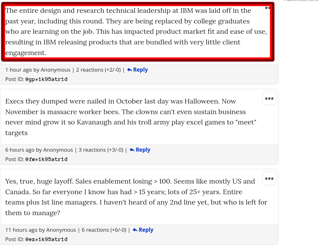 Notice her role/skills and see this new comment which says: "The entire design and research technical leadership at IBM was laid off in the past year, including this round. They are being replaced by college graduates who are learning on the job. This has impacted product market fit and ease of use, resulting in IBM releasing products that are bundled with very little client engagement."