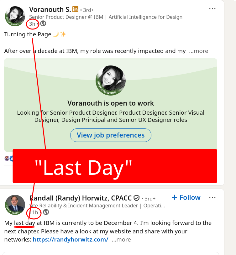 Last night: "Last Day" at IBM and Red Hat as "Stealth Layoffs" (They Force People to Pretend It's Wilful)