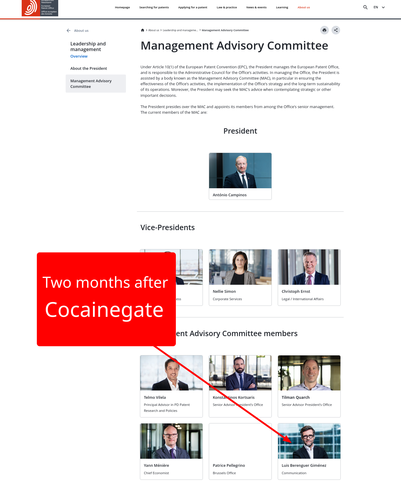 At the EPO, sober managers seem like a scarce resource. In the Benoît Battistelli days we heard about drunken management and since António Campinos came (despite a lack of background in patents) we kept hearing about substance abuse, not just alcohol but also cocaine. In recent weeks those who had spread those rumours got vindicated; the "circle" of Campinos does in fact do cocaine.
