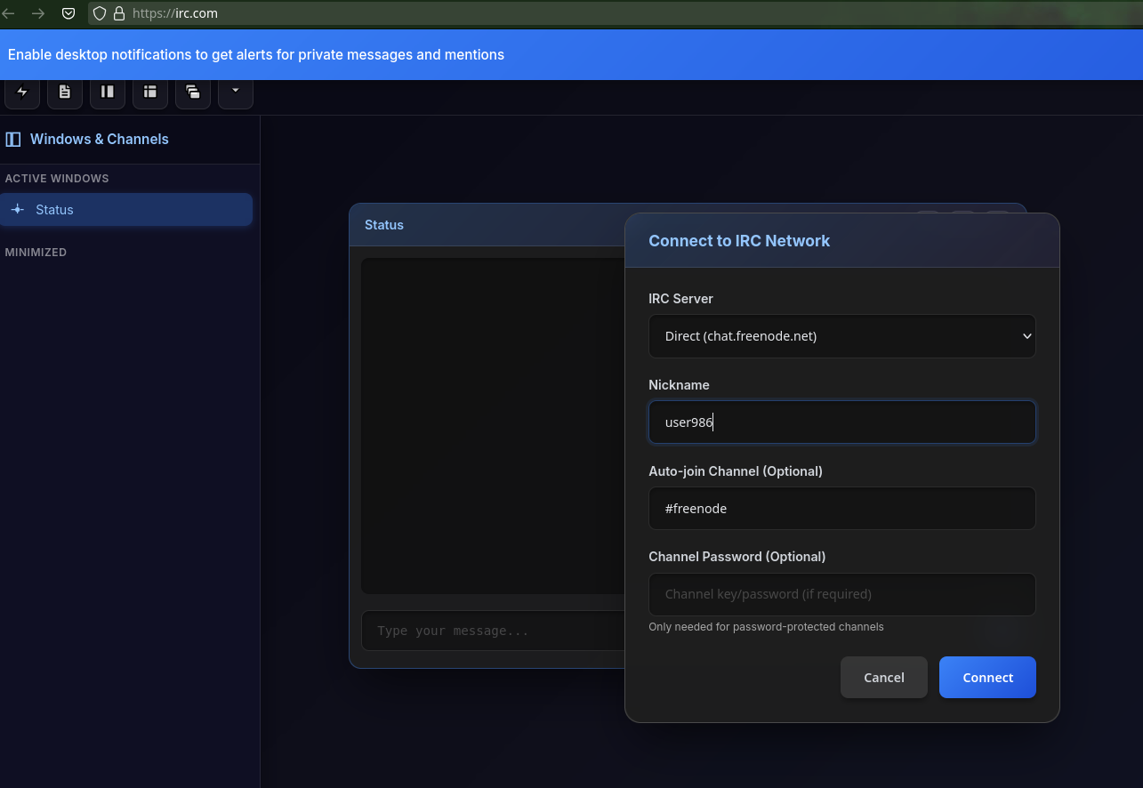 It links to a 'webapp' in irc.com: (that domain is owned by the same person and run by the same people with thousands still online)