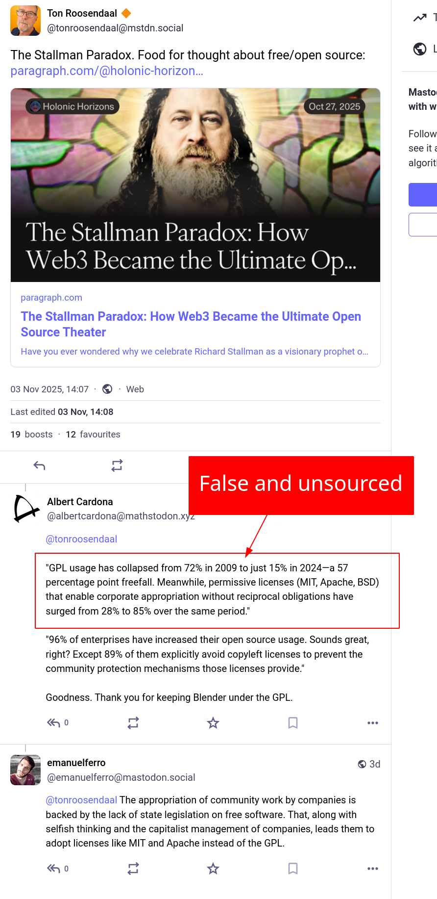 The man behind Blender, a prominent adopter of the GPL (turning proprietary software into Free software and rejecting GitHub for very good reasons), has since linked to it and the FUD was reproduced in replies: