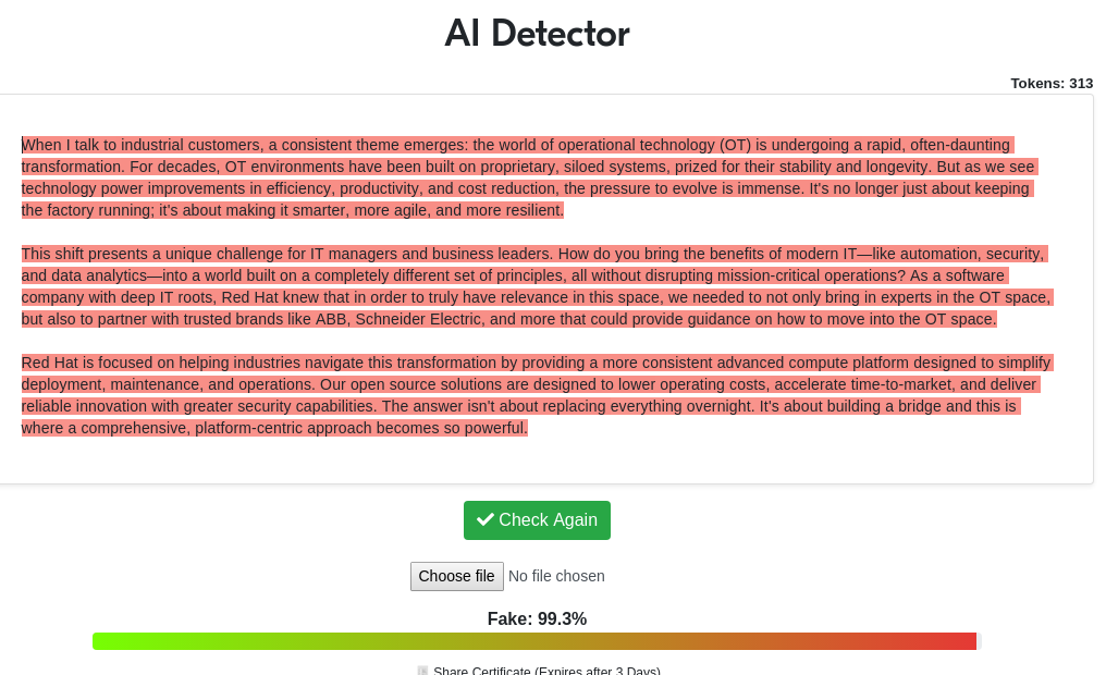 IBM Red Hat keeps promoting slop like it's all the rage. Suffice to say, when one is surrounded by other raging enthusiasts of plagiarism, one is inclined to think it is acceptable. Consider SUSE.