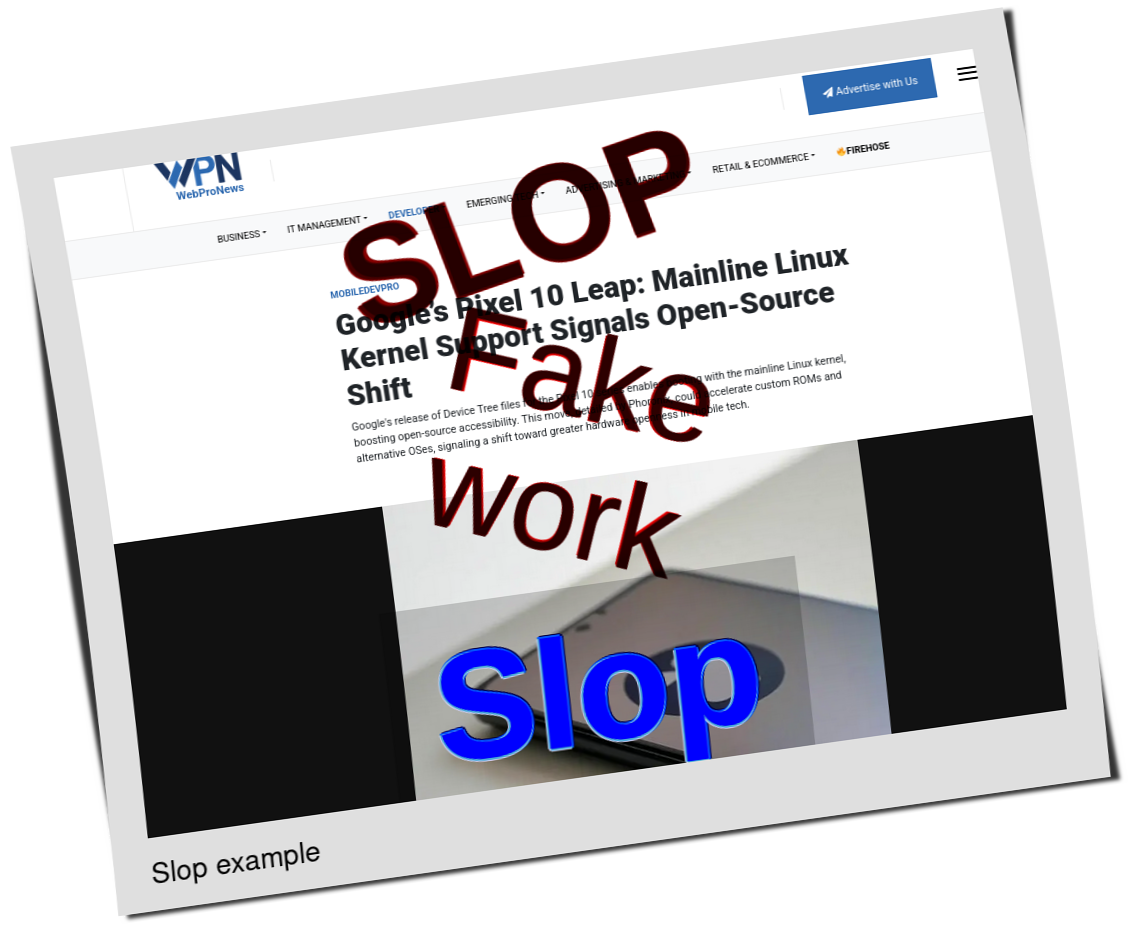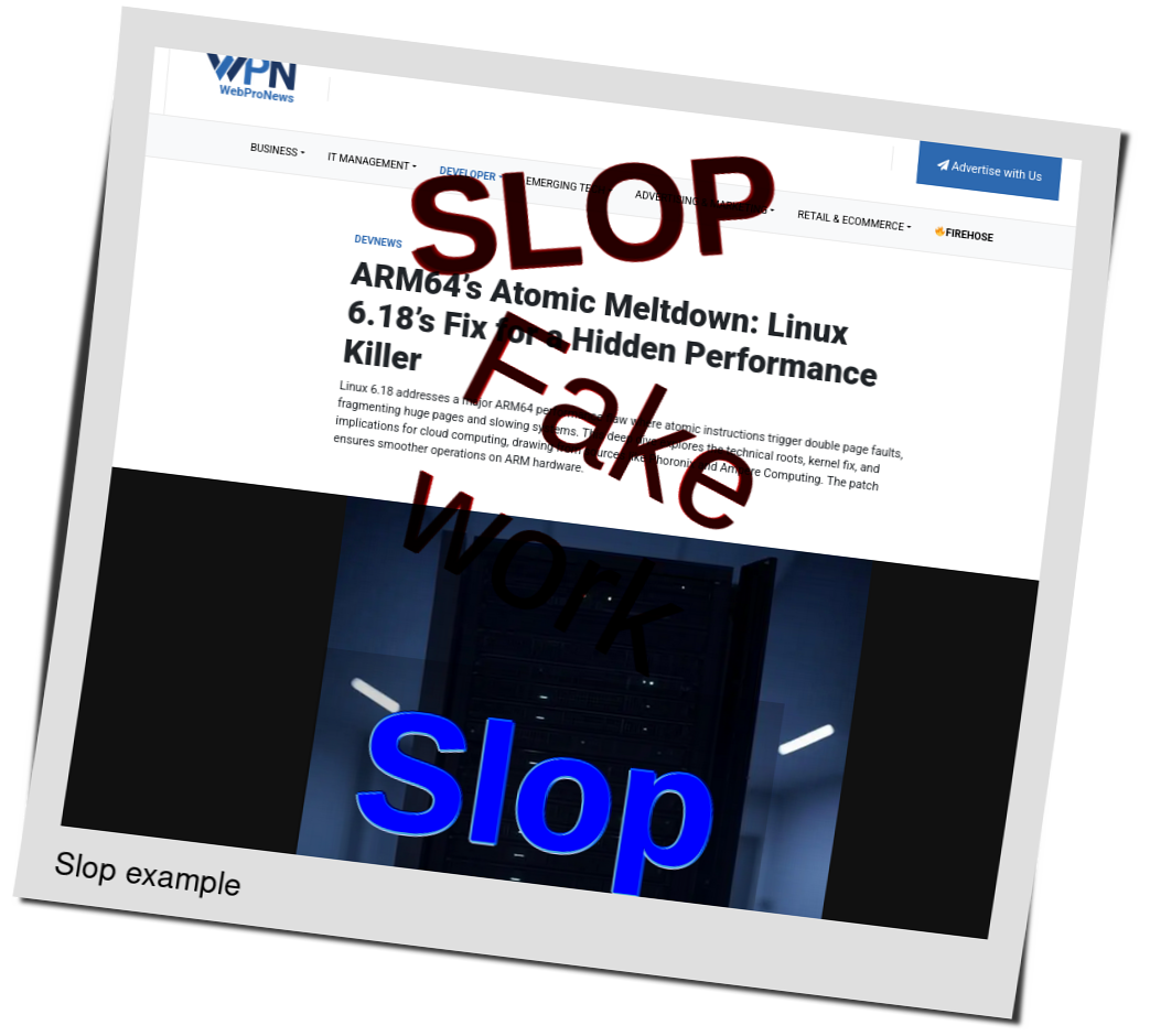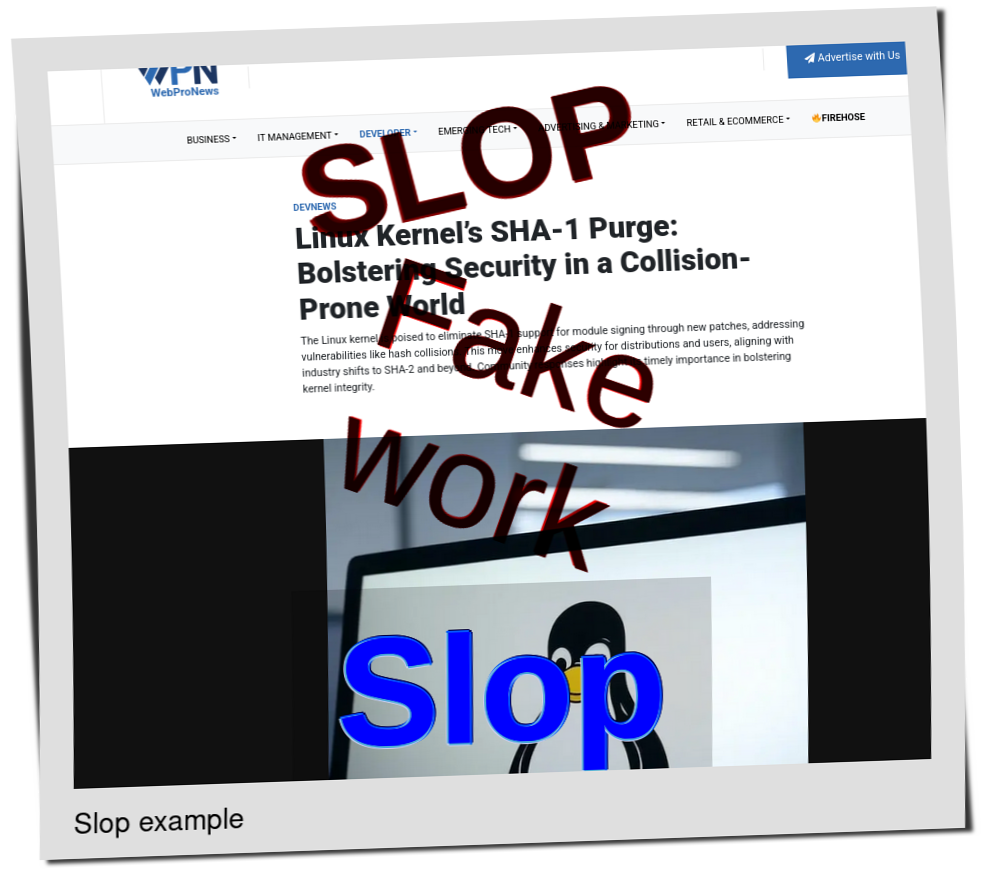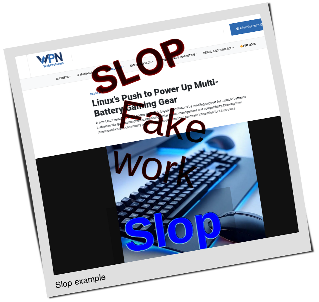 Speaking of terrible stuff, if you search Google News for "linux" news you're find WebProNews all over the place. It's a slopfarm with fake text, fake images, and fake author names. Some hours ago Google News spewed out 8 results (for "linux") from this slopfarm, including this topic turned into slop: