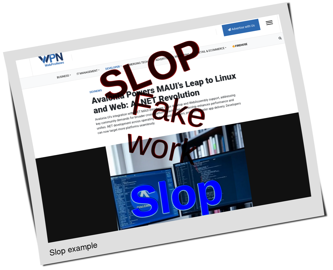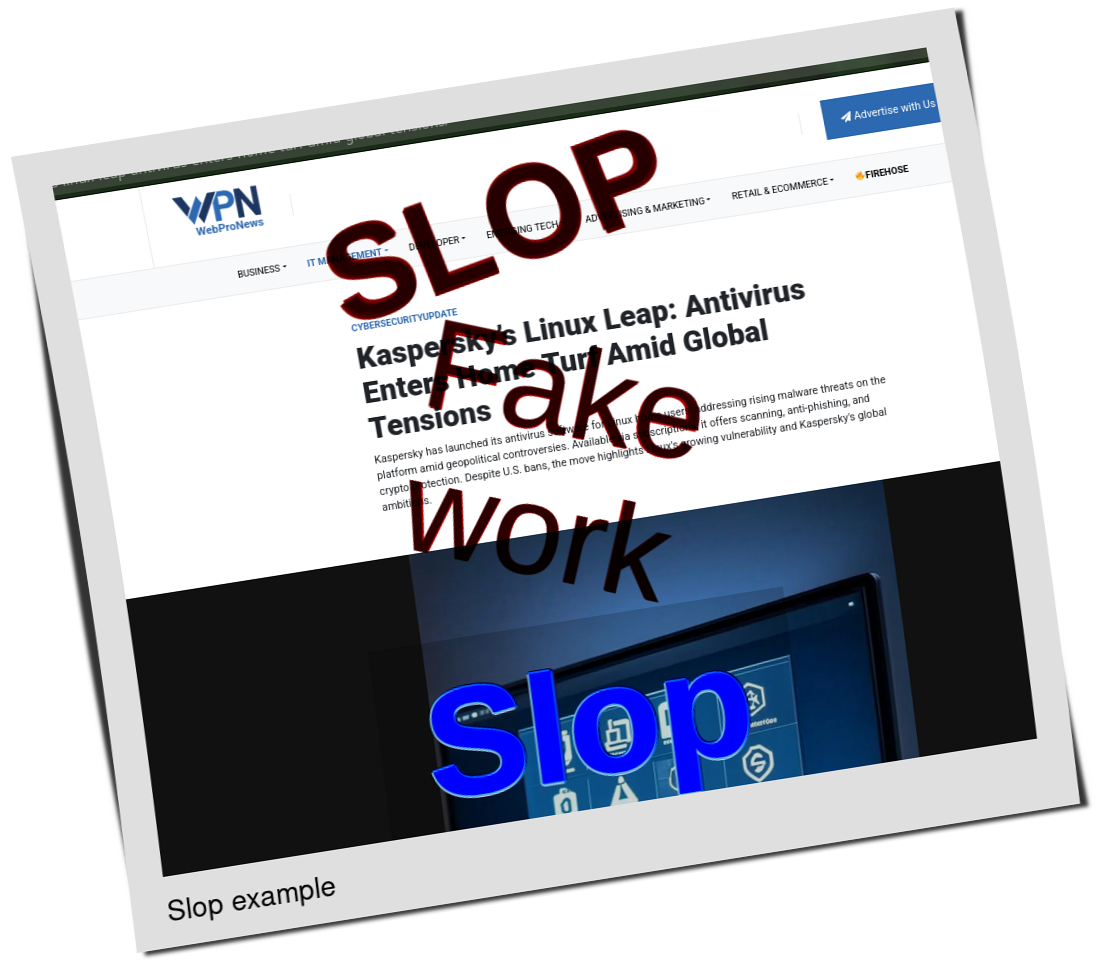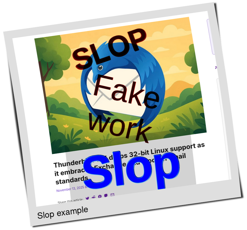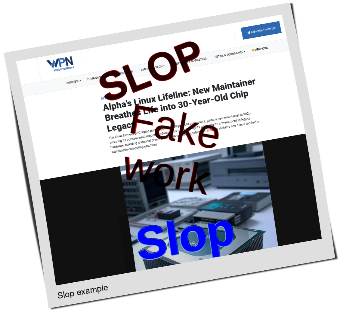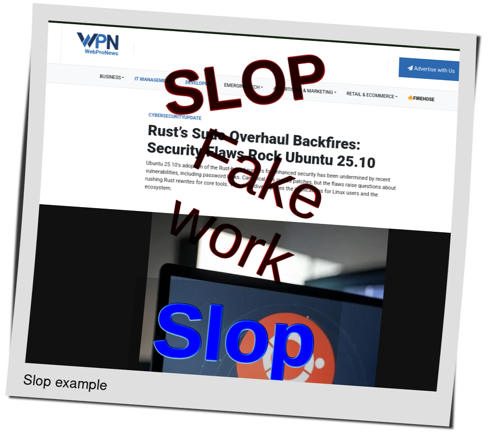 Speaking of terrible stuff, if you search Google News for "linux" news you're find WebProNews all over the place. It's a slopfarm with fake text, fake images, and fake author names. Some hours ago Google News spewed out 8 results (for "linux") from this slopfarm, including this topic turned into slop:
