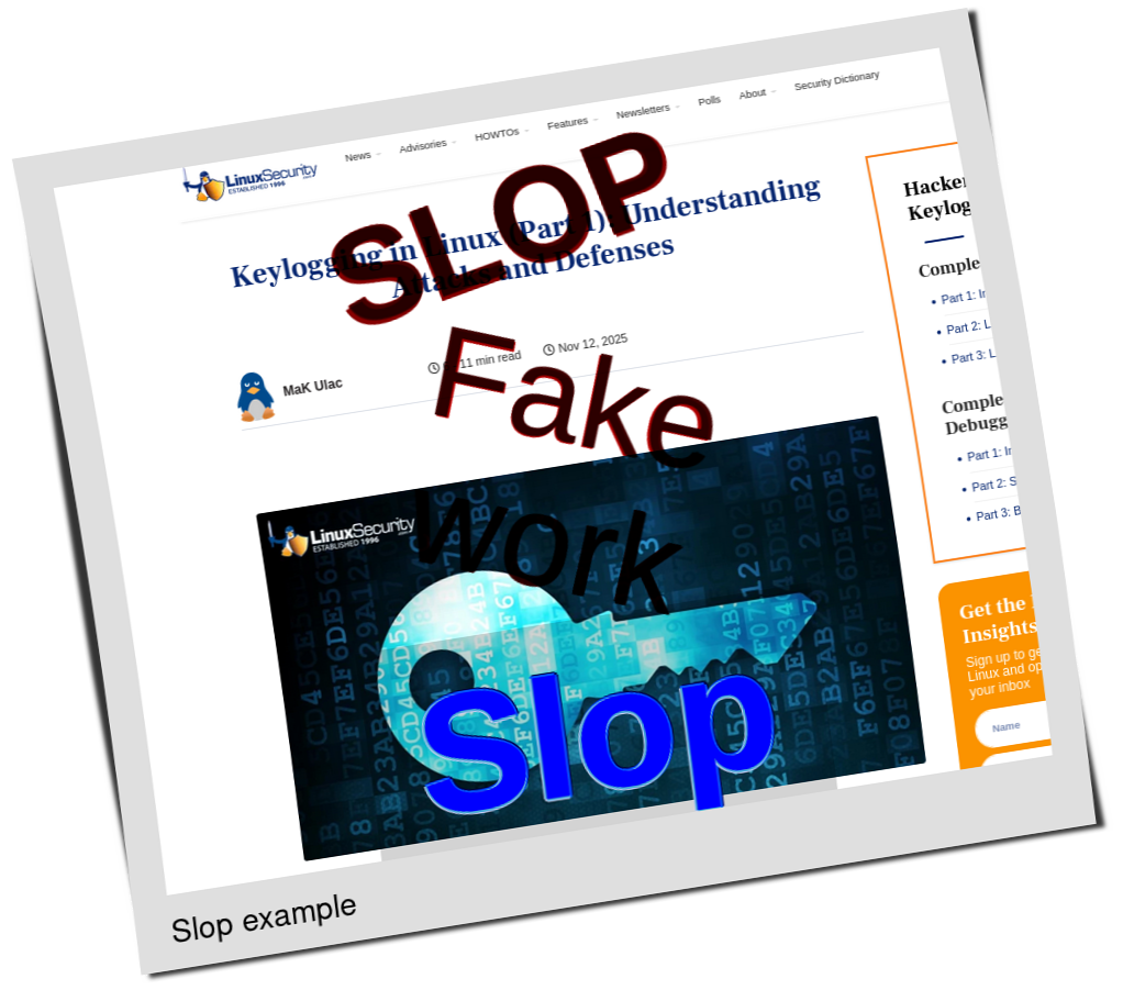 Tonight's Slopwatch starts with LinuxSecurity. The site used to publish more slop. It used to have real names associated with the slop. Not anymore.