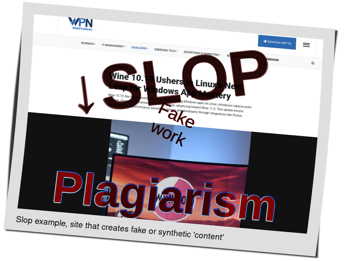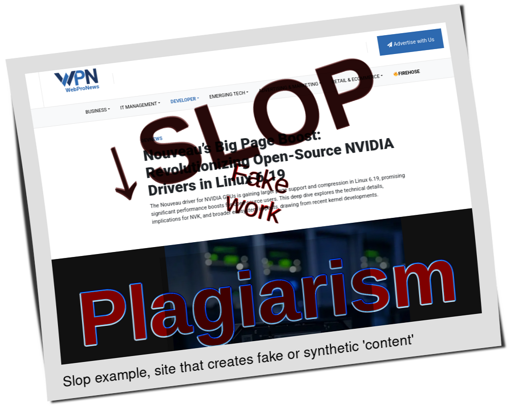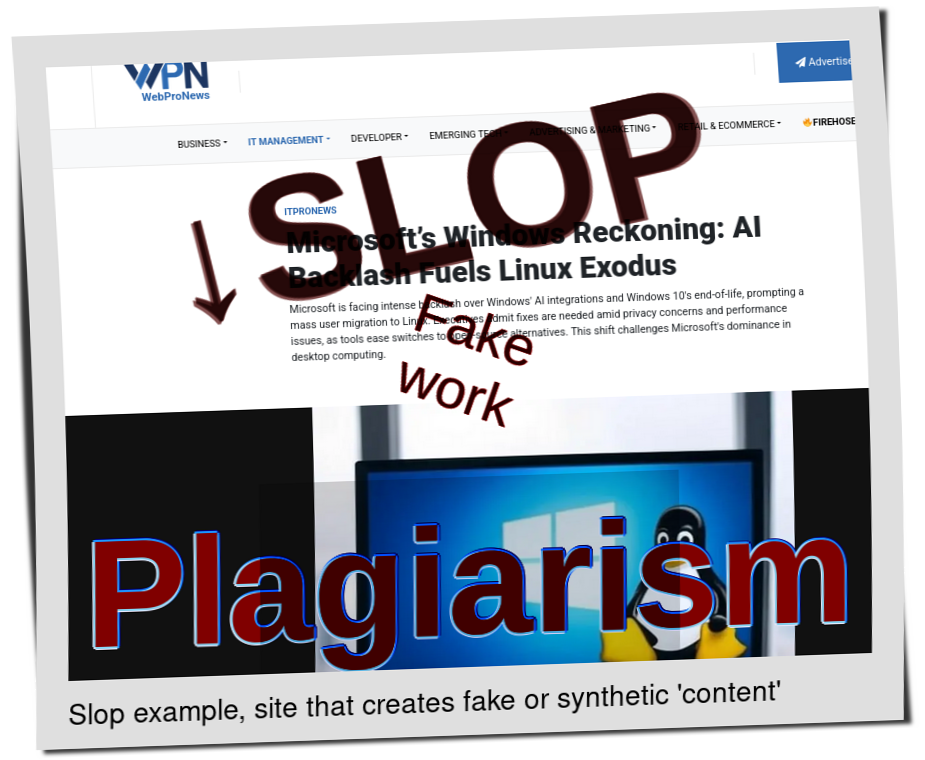 Slop about slop, as usual. How can this one slopfarm make up about 30% of all results in Google News for a "linux" search?