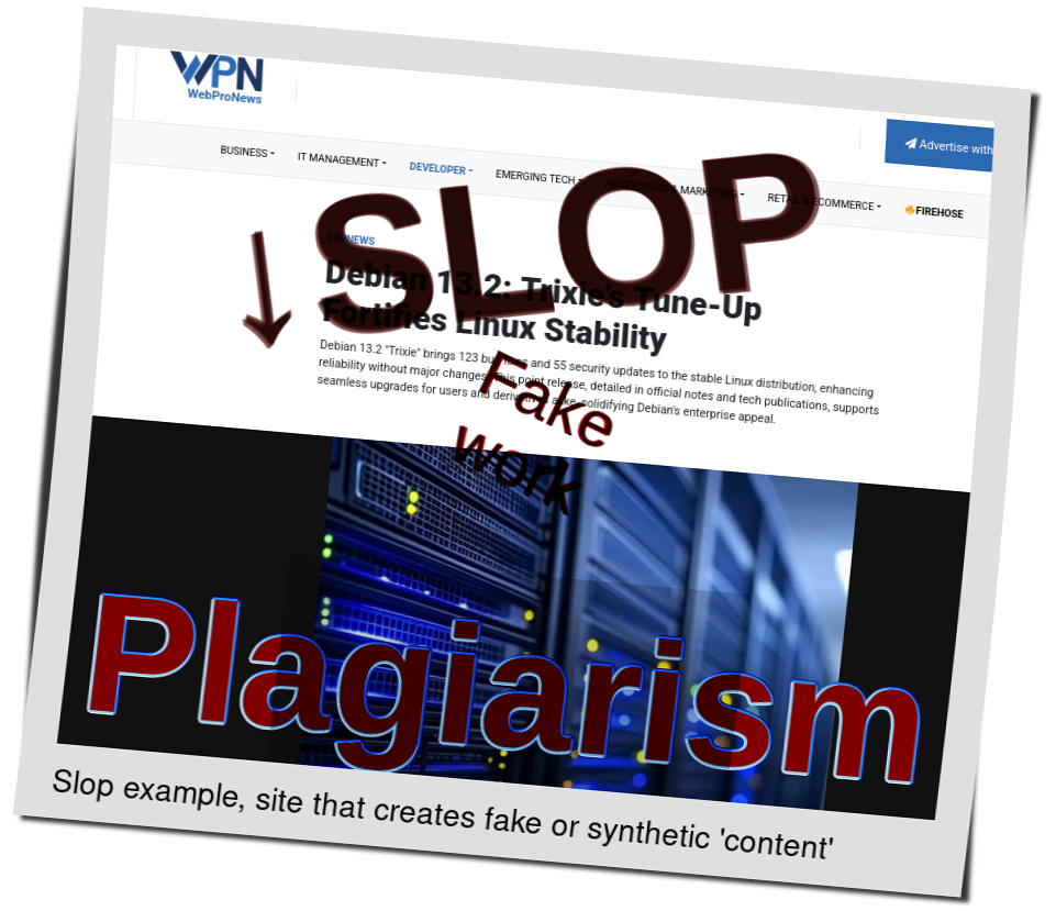 This Slopwatch will be short because we are not seeing much slop today, as noted earlier in the sister site. One exception is the slopfarm that Google News fancies, covering with LLM slop what other sites talk about.
