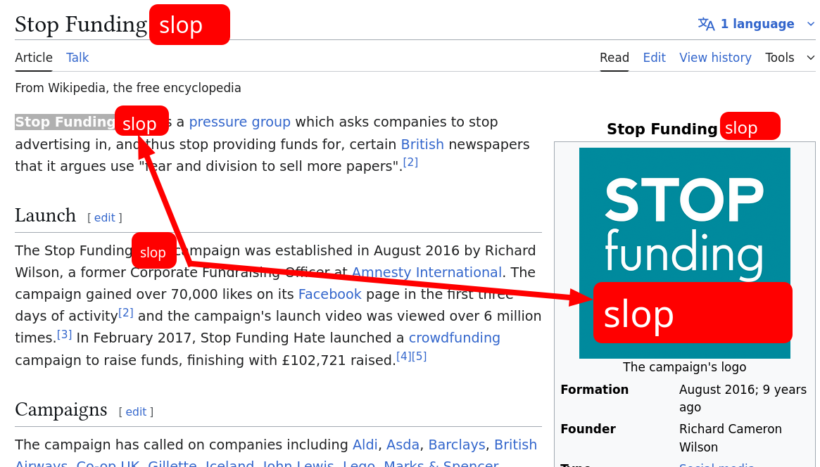 There used to be online campaigns that sought to imperil the advertising industry or the media - i.e. its sinister 'twin' - to "stop sponsoring hate" (the slogan or motto was usually "Stop Funding Hate"); we need to do the same for slop. █