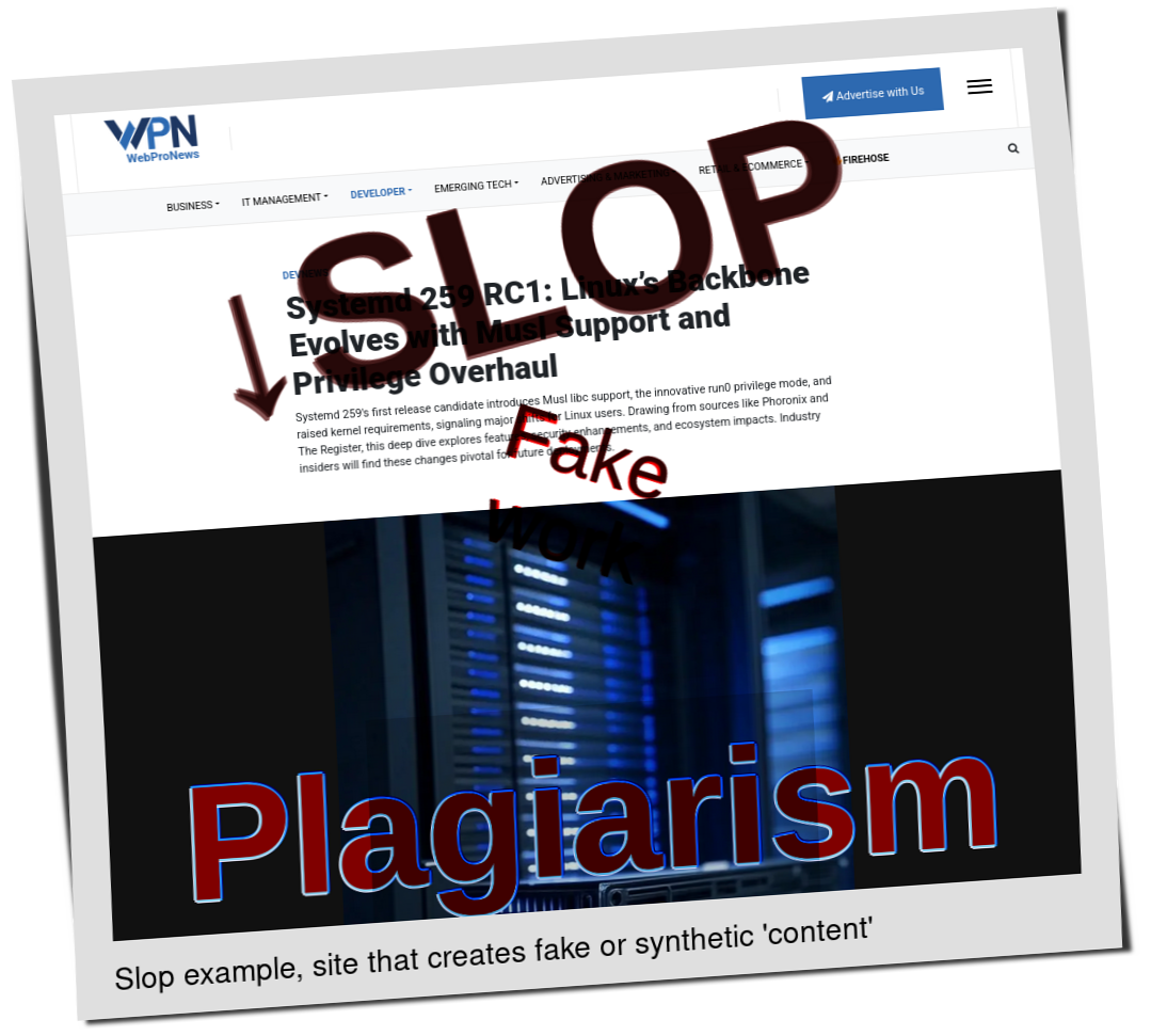 We were certainly going to do another Slopwatch, but as we noted yesterday, Google News hasn't much left of it (slopfarms), at least not so far this week. We found only one example under "linux" (Linux):
