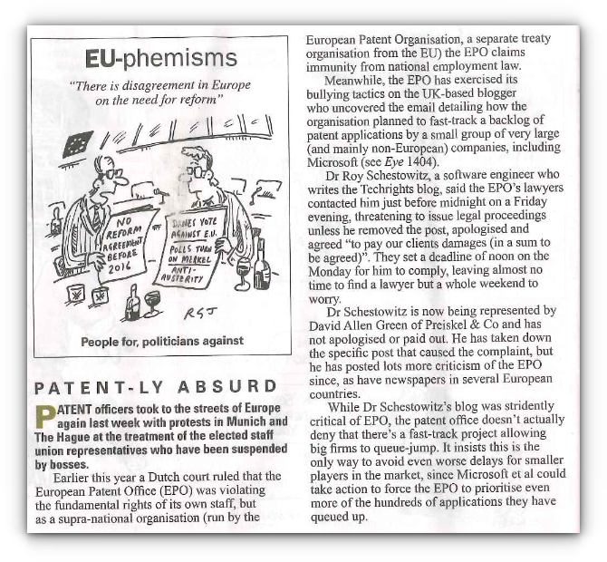 The BILD article is behind a paywall but can be accessed here. We gave this URL before. The story was repeated (without pictures) by other media such as Focus Online, we were reminded, and even lesser known sites in Austria [1, 2] (where EPO has a 'branch') and in Bavaria ('home base' of EPO)