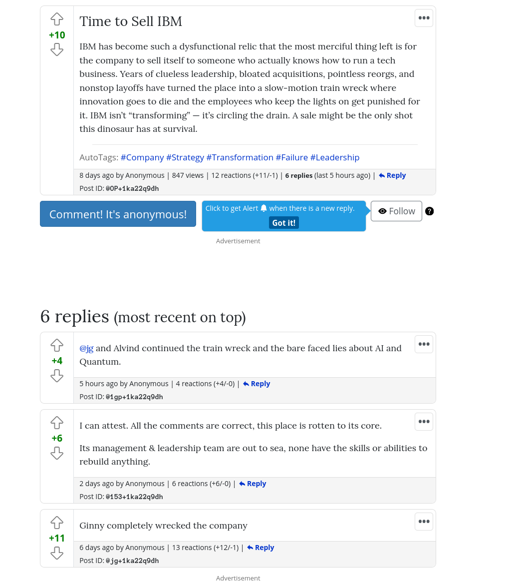 "...and [IBM CEO] Alvind continued the train wreck and the bare faced lies about AI and Quantum," wrote somebody a few hours ago in reply to claims that "Ginny [the previous CEO] completely wrecked the company..." (written 6 days ago by Anonymous)