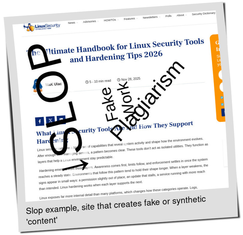 We've hardly had enough for an installment of Slopwatch lately. All I could find today was a pair of fake article by a LinuxSecurity pseudonym: