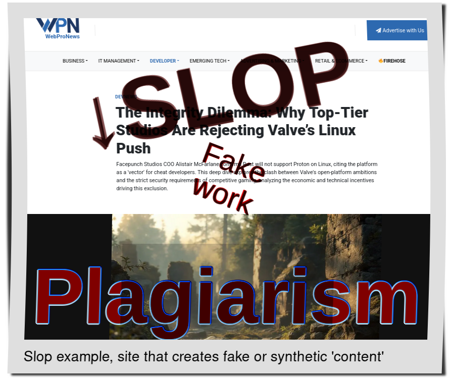 Searching the Web for "linux", the sole one we see in Google News coming from a slopfarm is this: